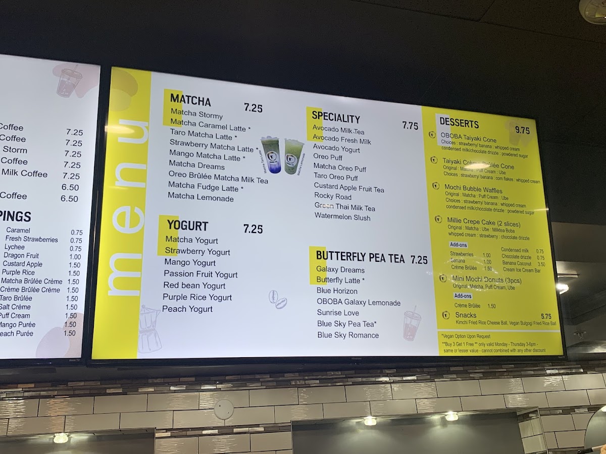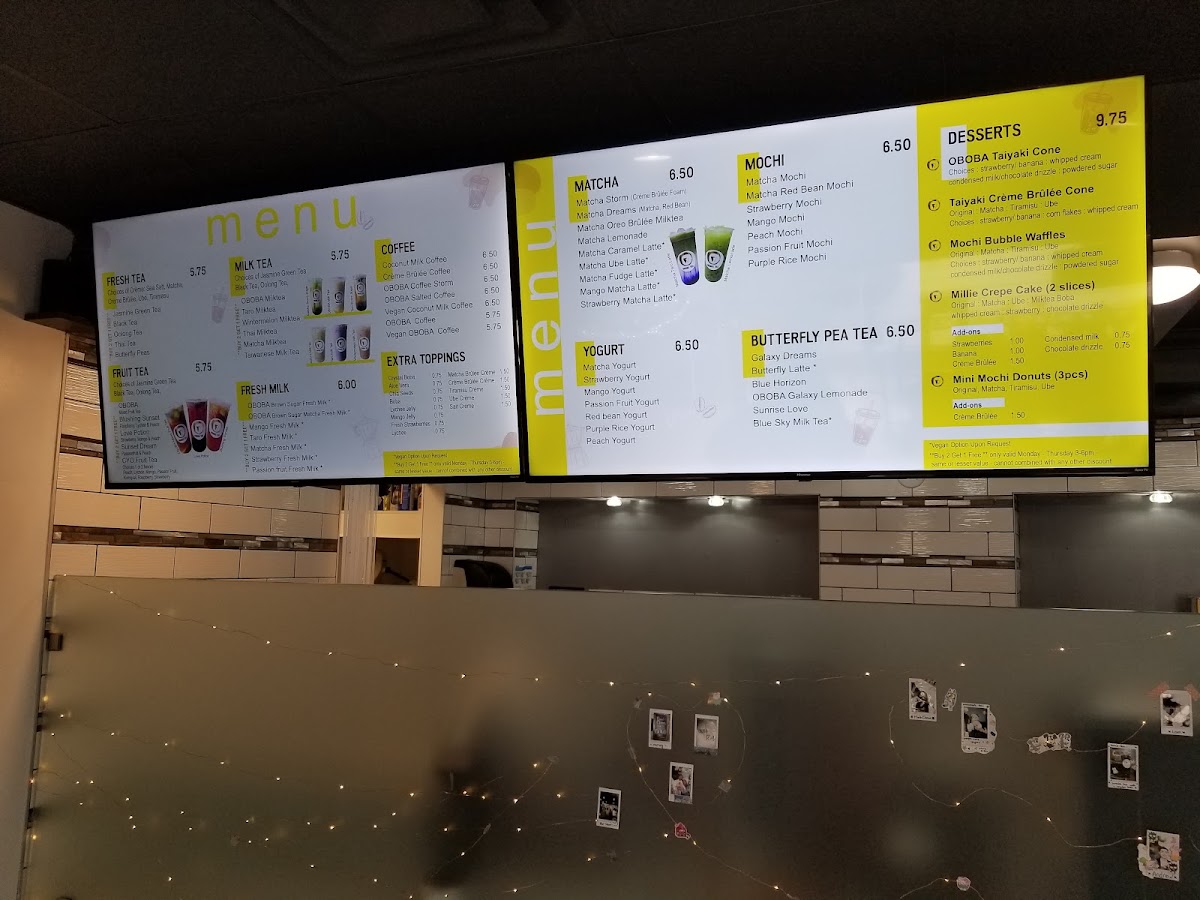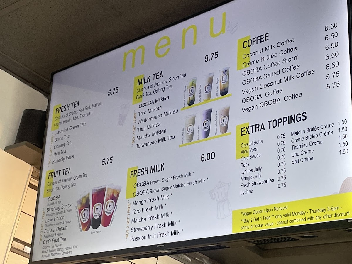 The menu at Oboba Tea offers a refreshing mix of unique beverages, perfect for any tea or smoothie lover. The Matcha Thai Latte combines the rich, earthy flavors of matcha with a sweet Thai twist, offering a unique, flavorful experience. For something a bit lighter, the Coconut Smoothie provides a tropical, creamy treat that’s both refreshing and satisfying. If you're in the mood for something indulgent, the OBOBA Brown Sugar Fresh Milk is a standout with its velvety sweetness and creamy texture, a true crowd-pleaser. Those who prefer a classic tea flavor will enjoy the Matcha Latte, which highlights the smooth, bitter notes of matcha with a balanced sweetness. For a playful, sweet twist, the Cupid is a delightful option that combines fruity flavors with a touch of romance. Whether you're looking for something creamy, fruity, or tea-based, Oboba Tea's menu caters to a variety of tastes, making it a great stop for anyone in the Temecula area.